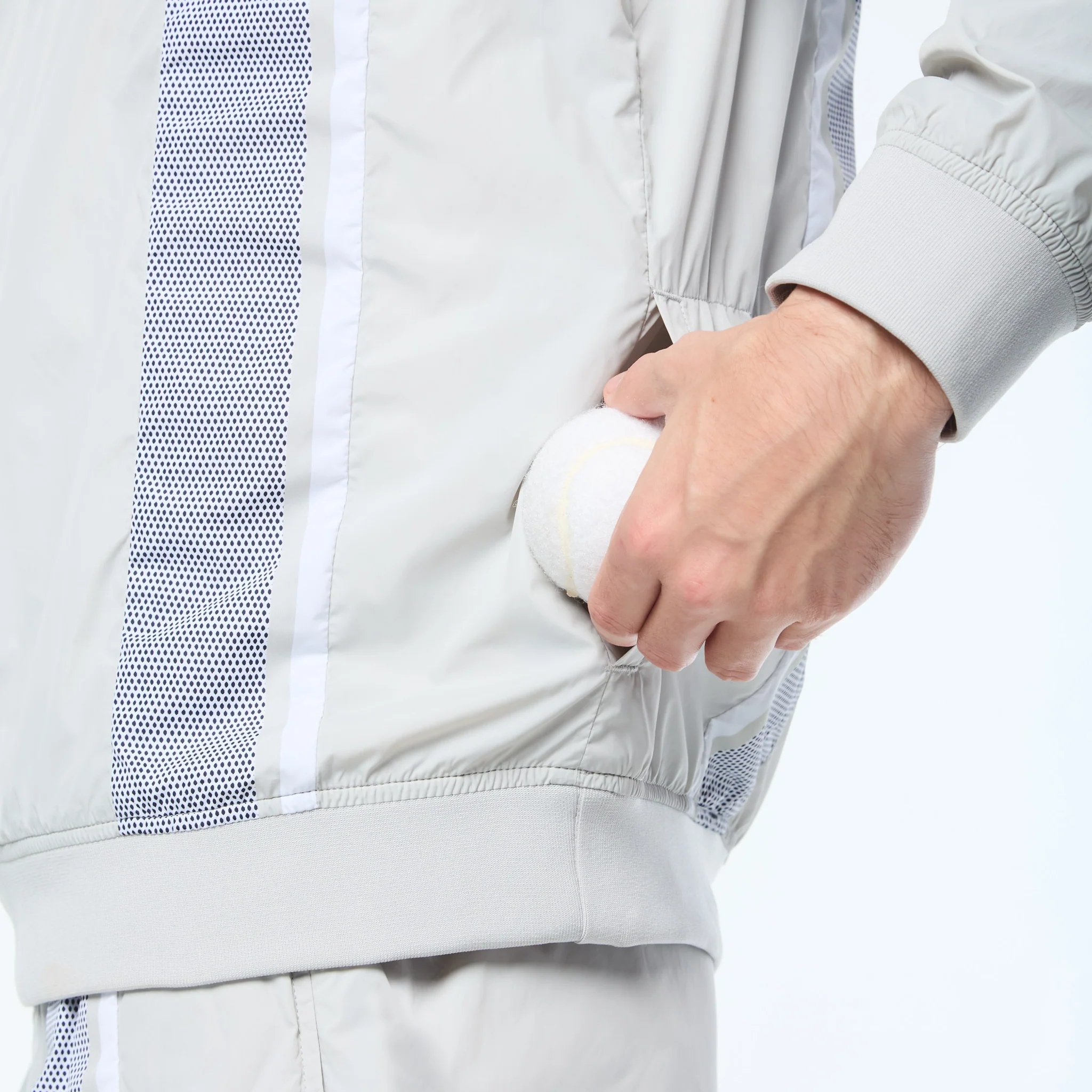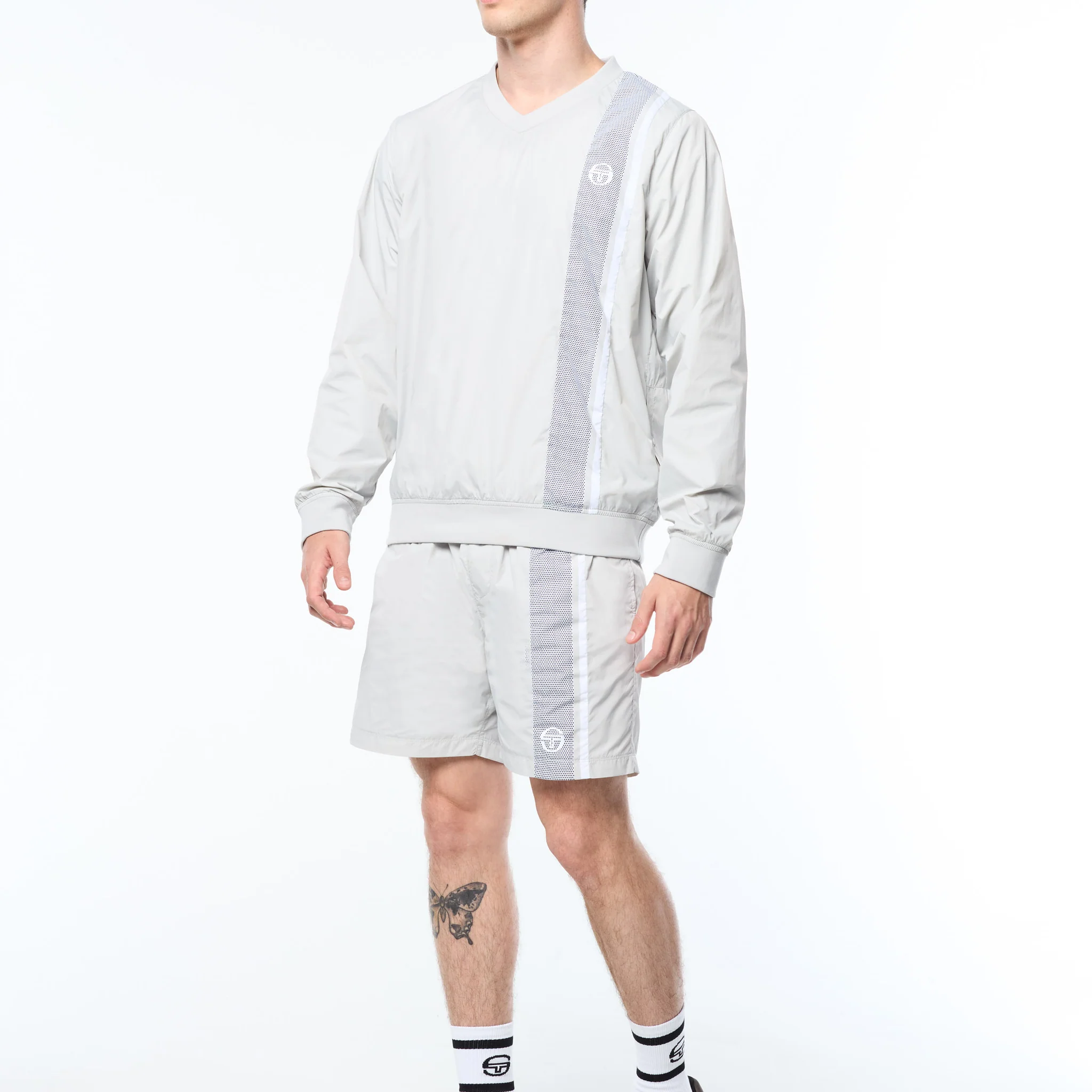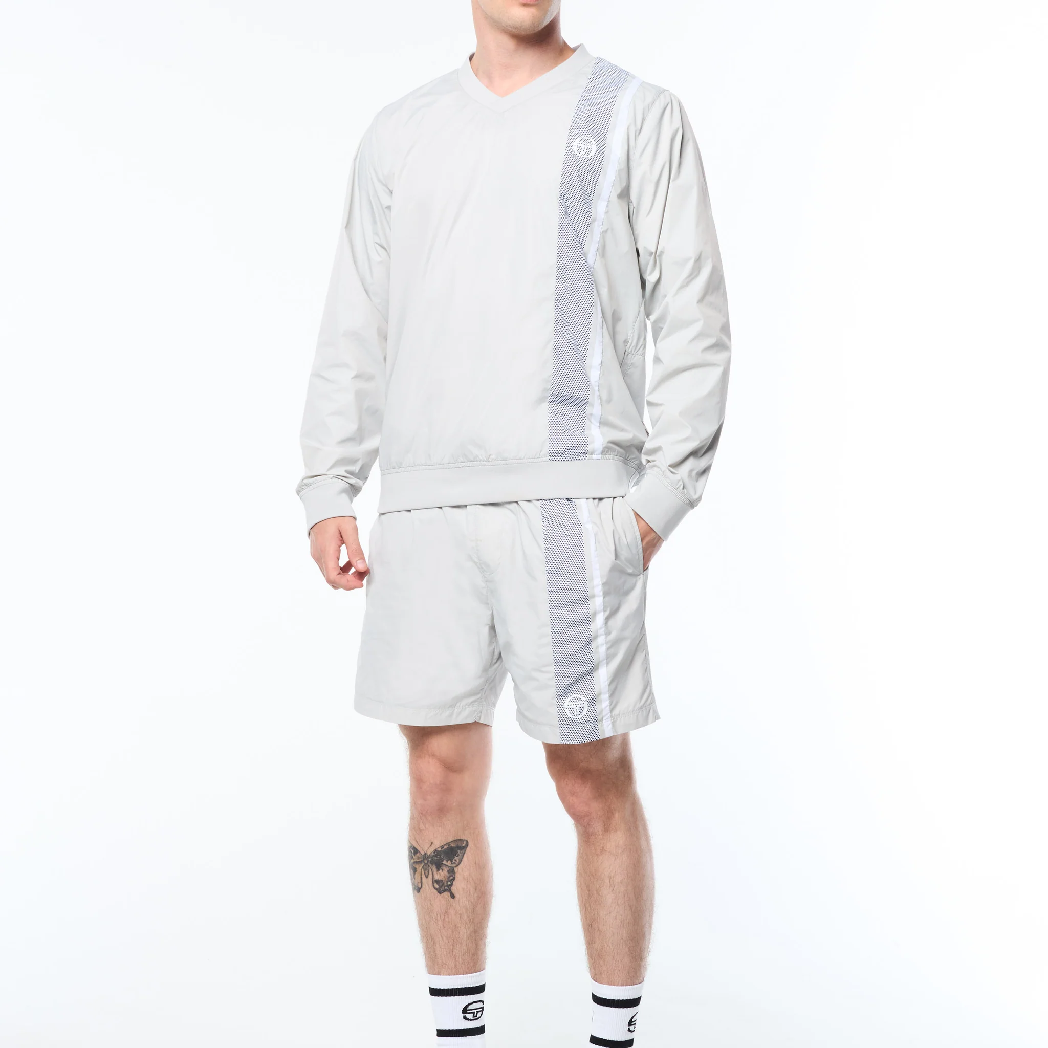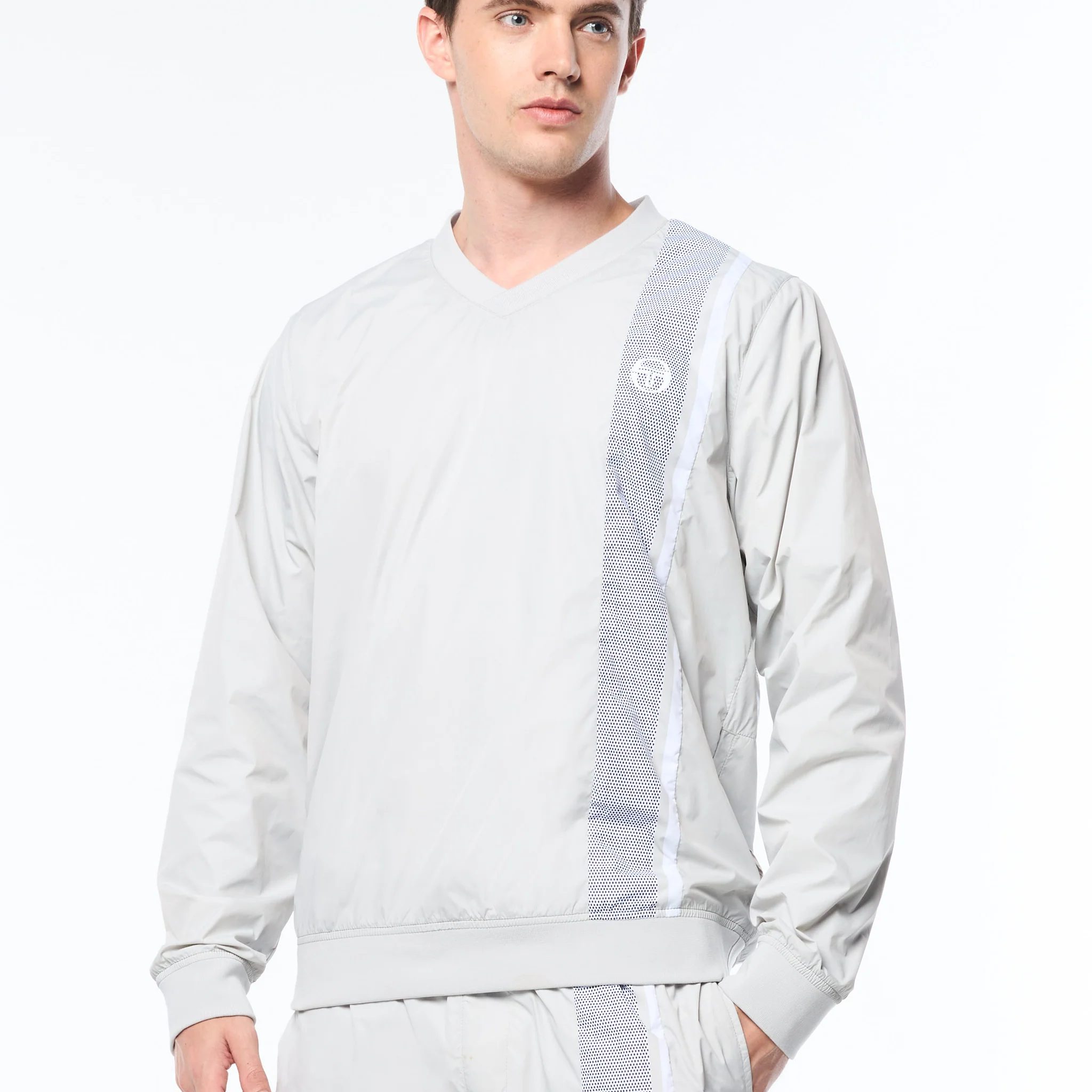 Layer up in lightweight performance. The Attivo Damarindo Crewneck is crafted from crisp nylon taffeta for a sleek, athletic look—ideal for transitional weather or training on the go. Featuring a soft rib-knit V-neck for added comfort, this easy-to-wear pullover is finished with a convenient snap-button pocket and our signature Damarindo double stripe in a bold mesh-effect print down the front.