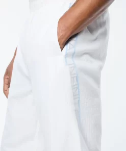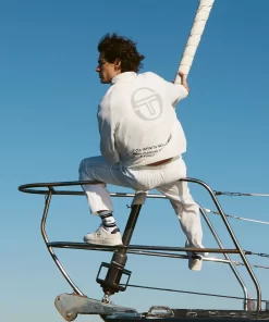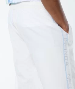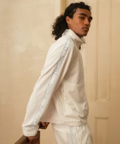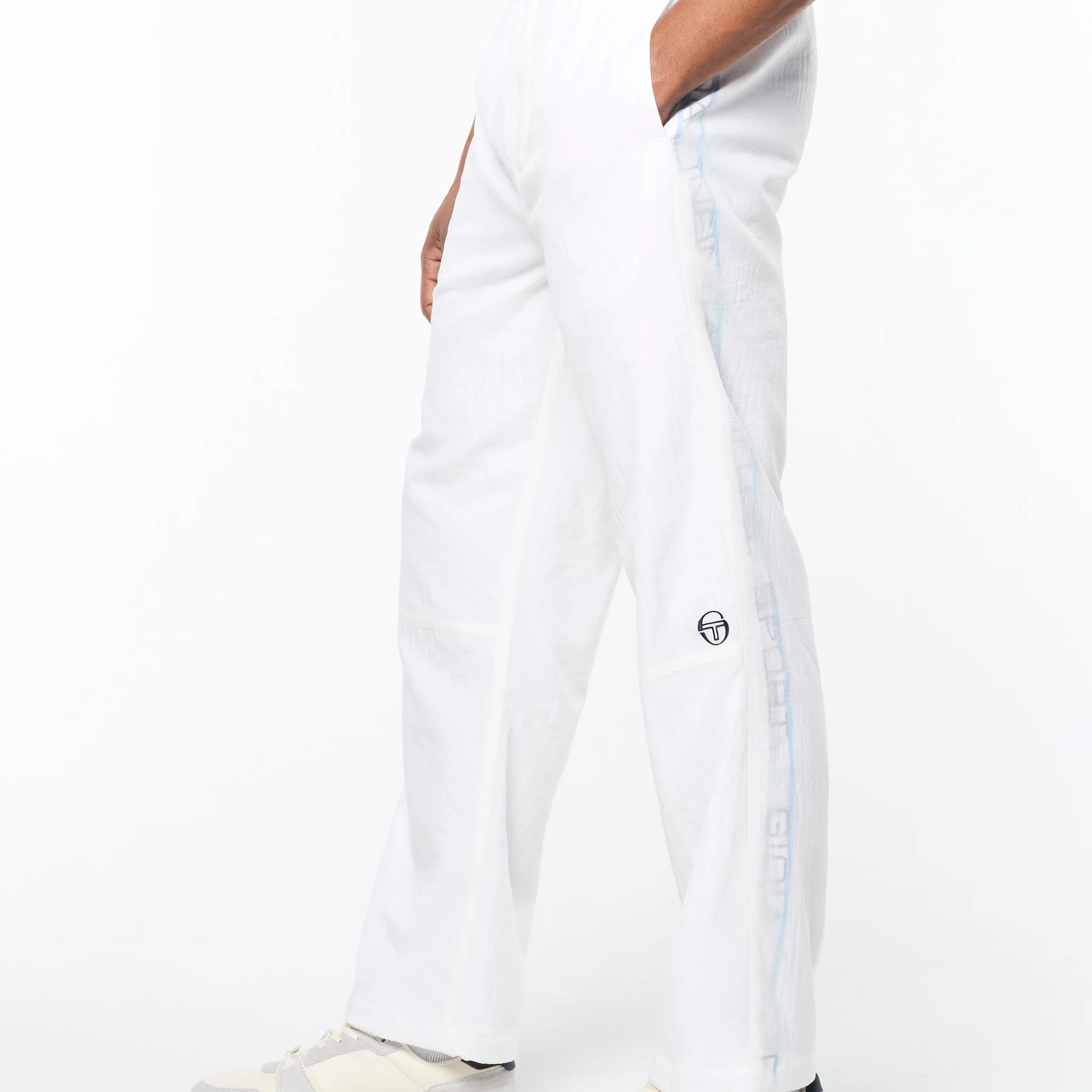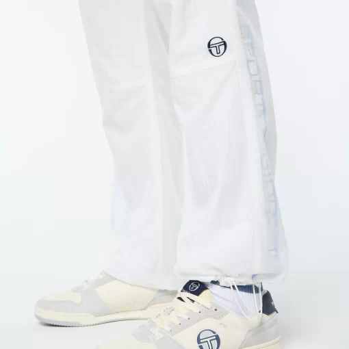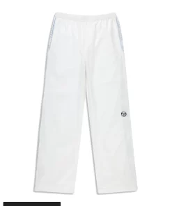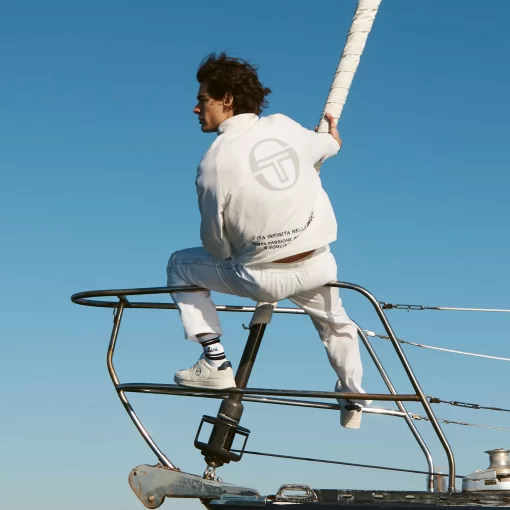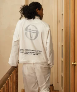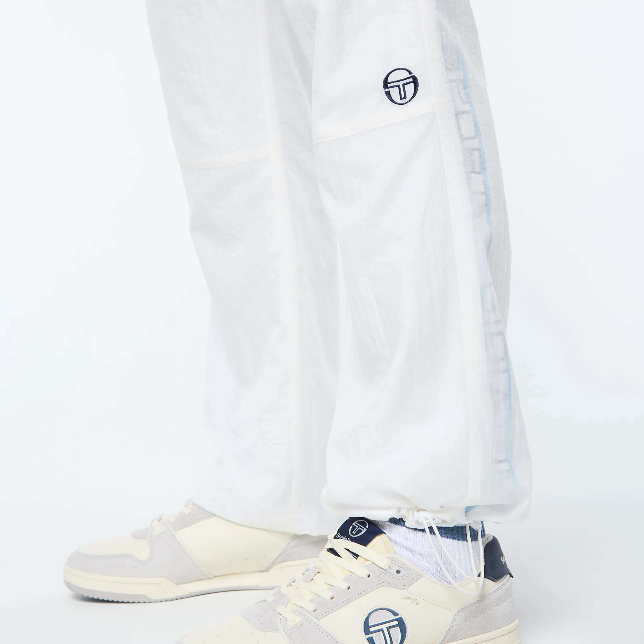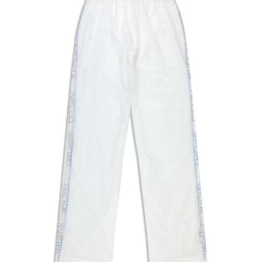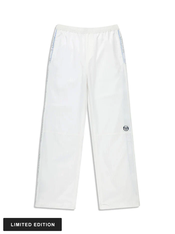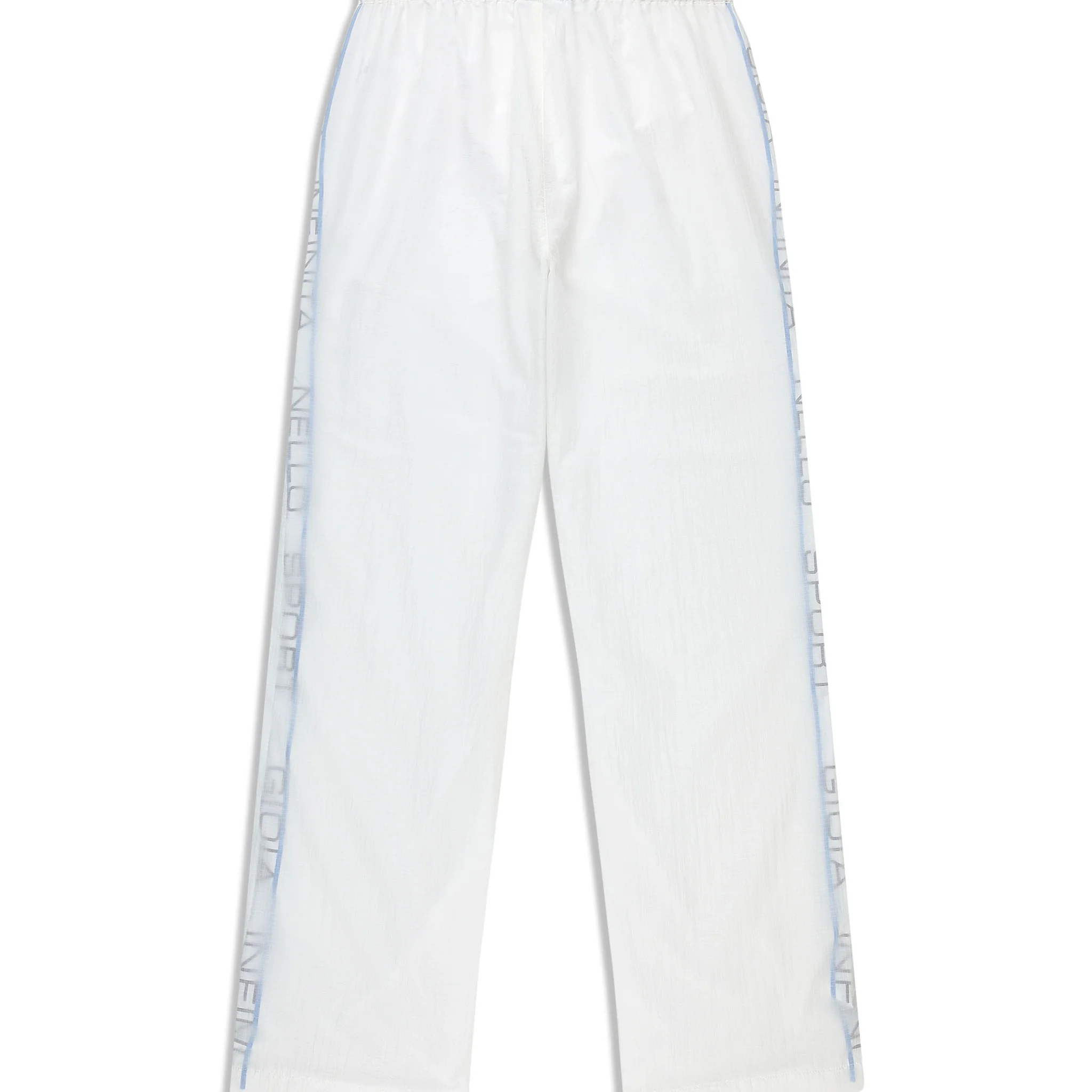 An elevated spin on classic athleticwear. The Faro Track Pant is crafted with a translucent stretch ripstop exterior featuring zip-secured pockets and an embroidered ‘ST’ monogram at the left knee. A solid inner lining boasts striped taping with a sports slogan repeat down the legs, creating a visual effect through the ripstop shell. Gioia infinita nello sport!