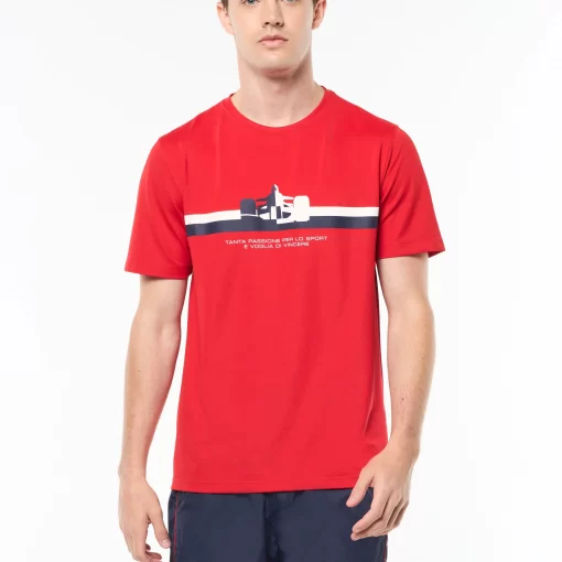 The Macchina T-Shirt is crafted from breathable stretch piqué fabric to keep you cool and moving freely throughout your day. Featuring custom Sergio Tacchini racing artwork, an Italian sports slogan, and stripe accents, this premium tee is perfect for both athletic pursuits and casual wear.