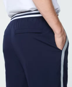 - Rib-knit waistband with double stripe accents and internal drawcord