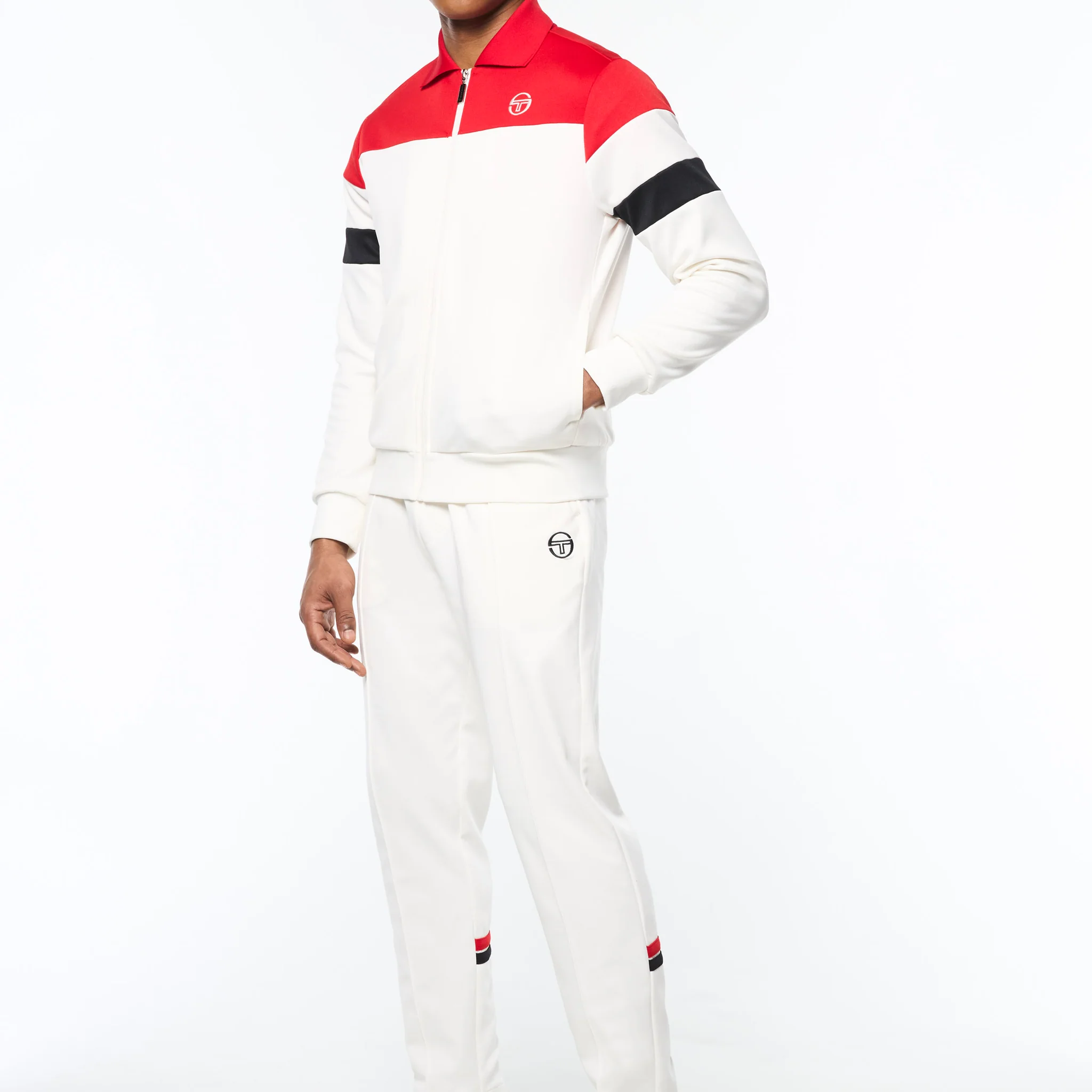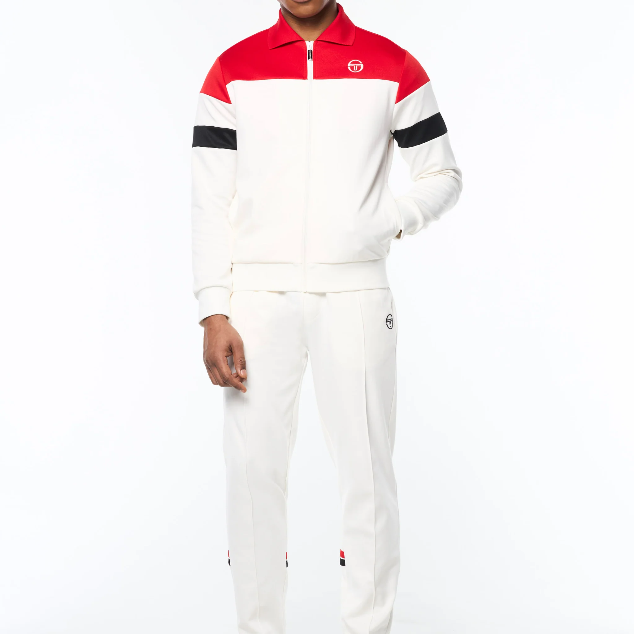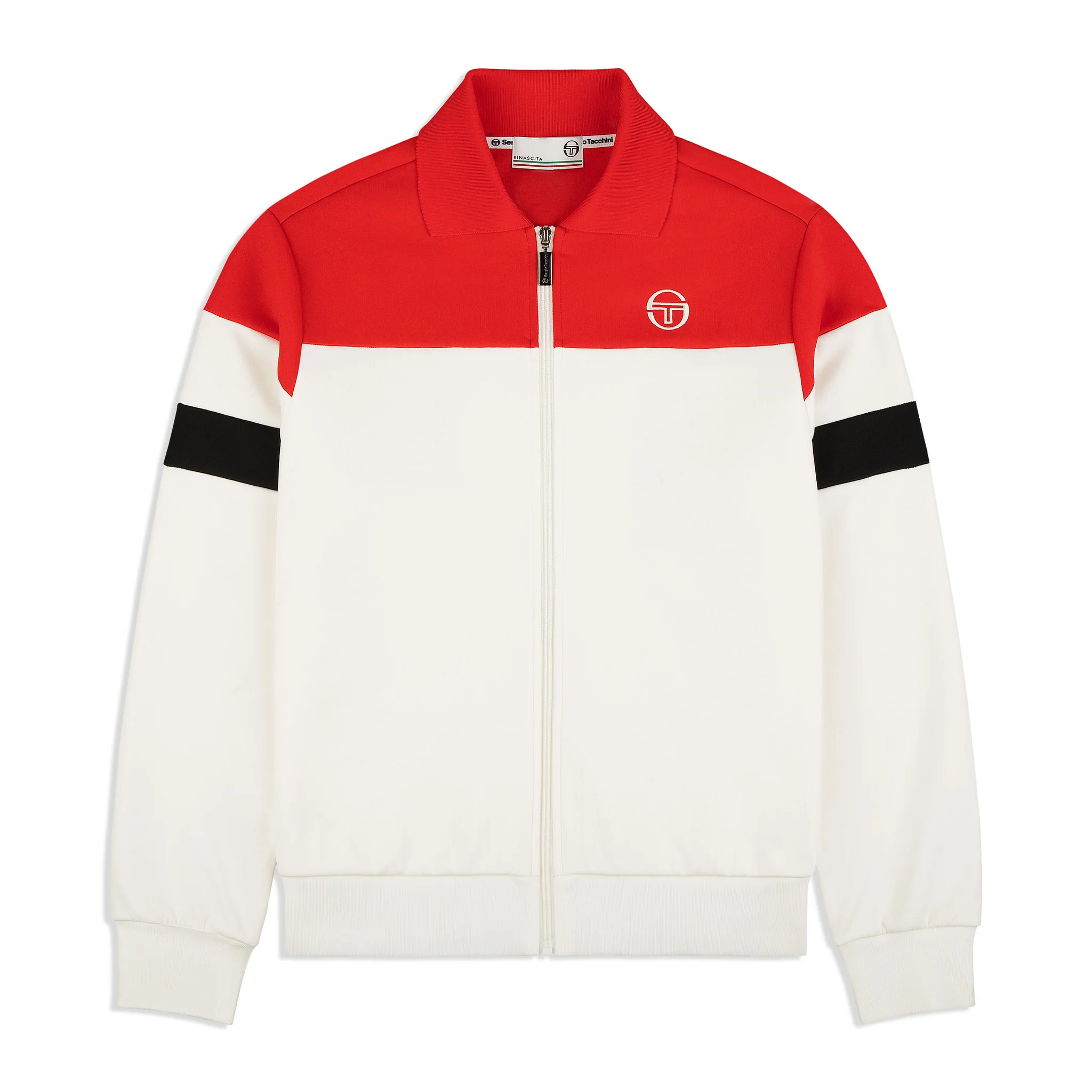 A Tacchini fan favorite, the Tomme Track Jacket is made of soft poly-cotton featuring color-blocked paneling and stripe bands at the sleeves for a retro vibe. Sporting an embroidered ‘ST’ monogram at the left chest, this premium full-zip track jacket is finished with a spread collar, spacious handwarmer pockets, and rib-knit trims.