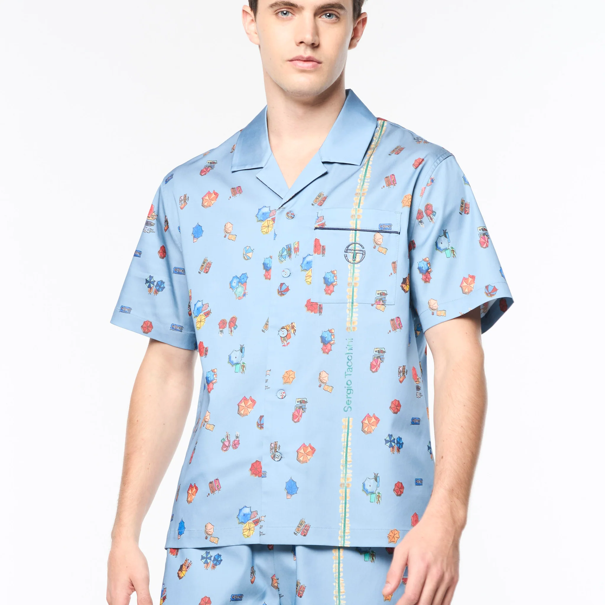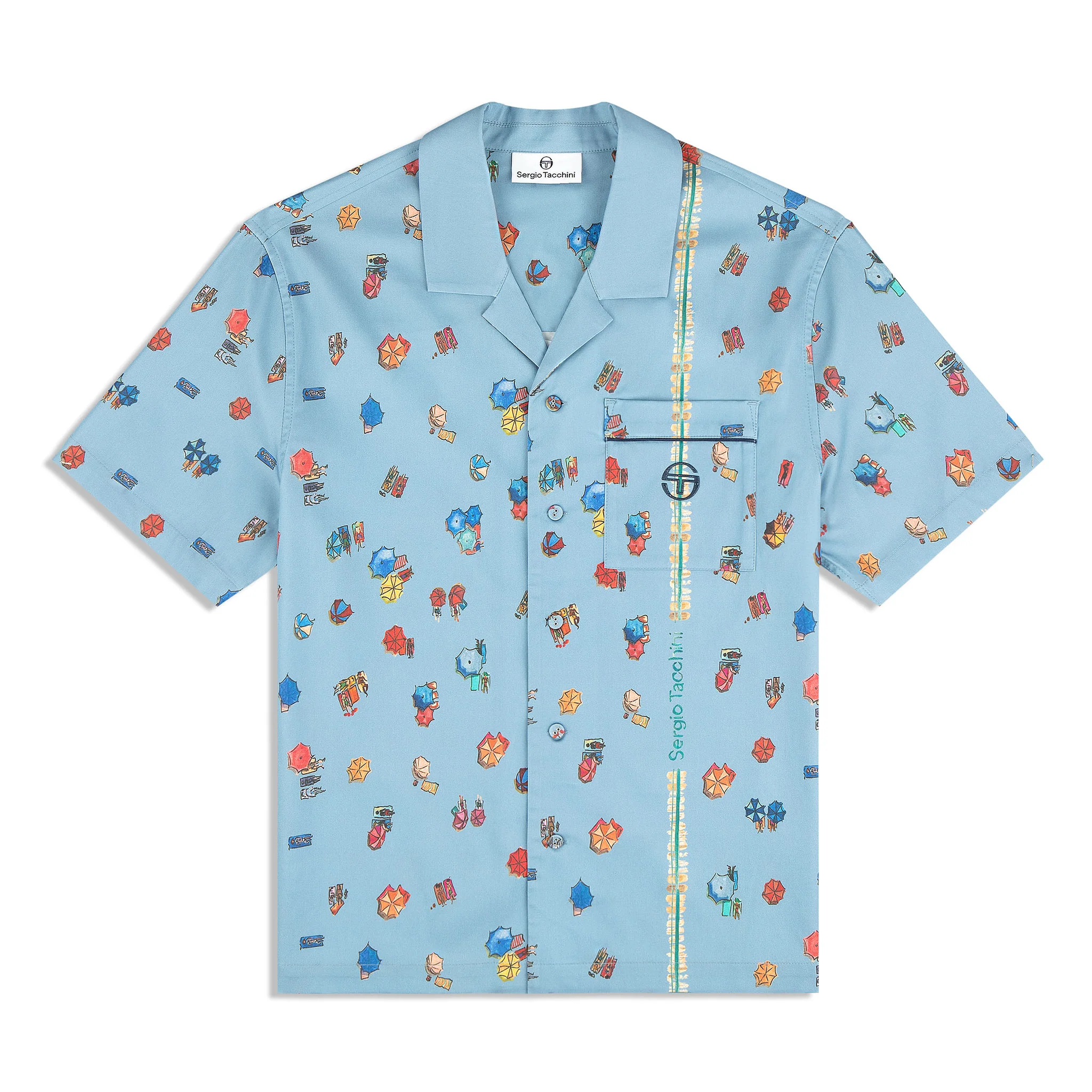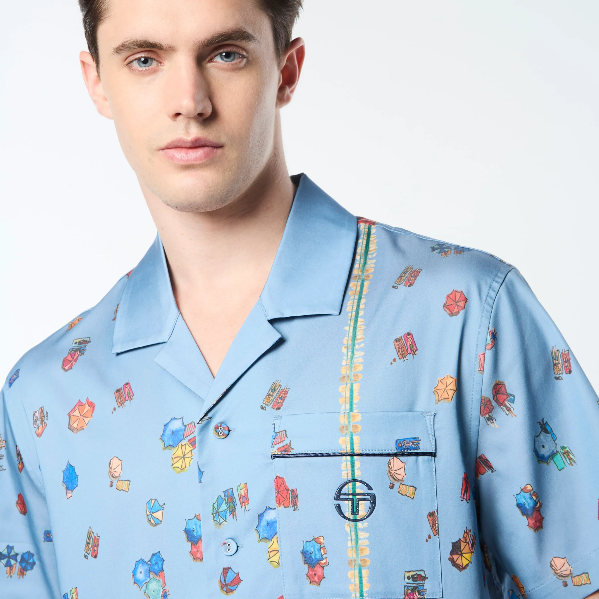 The Tosca Cabana Shirt is crafted from a luxurious Tencel-blend stretch fabric with a satin-like finish that’s exceptionally soft and smooth to the touch. Perfect for warmer weather, this leisure resort button-up features an all-over Mediterranean beach scene, casual camp collar, and a water droplet silicone ‘ST’ monogram at the chest pocket for a seaside vibe.