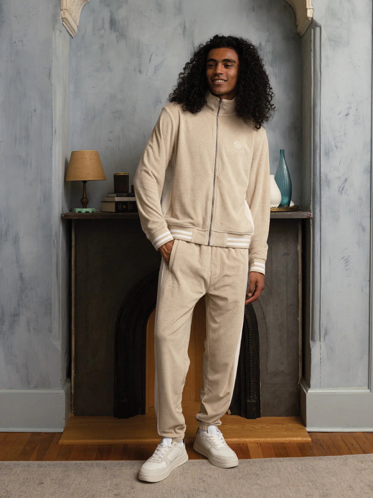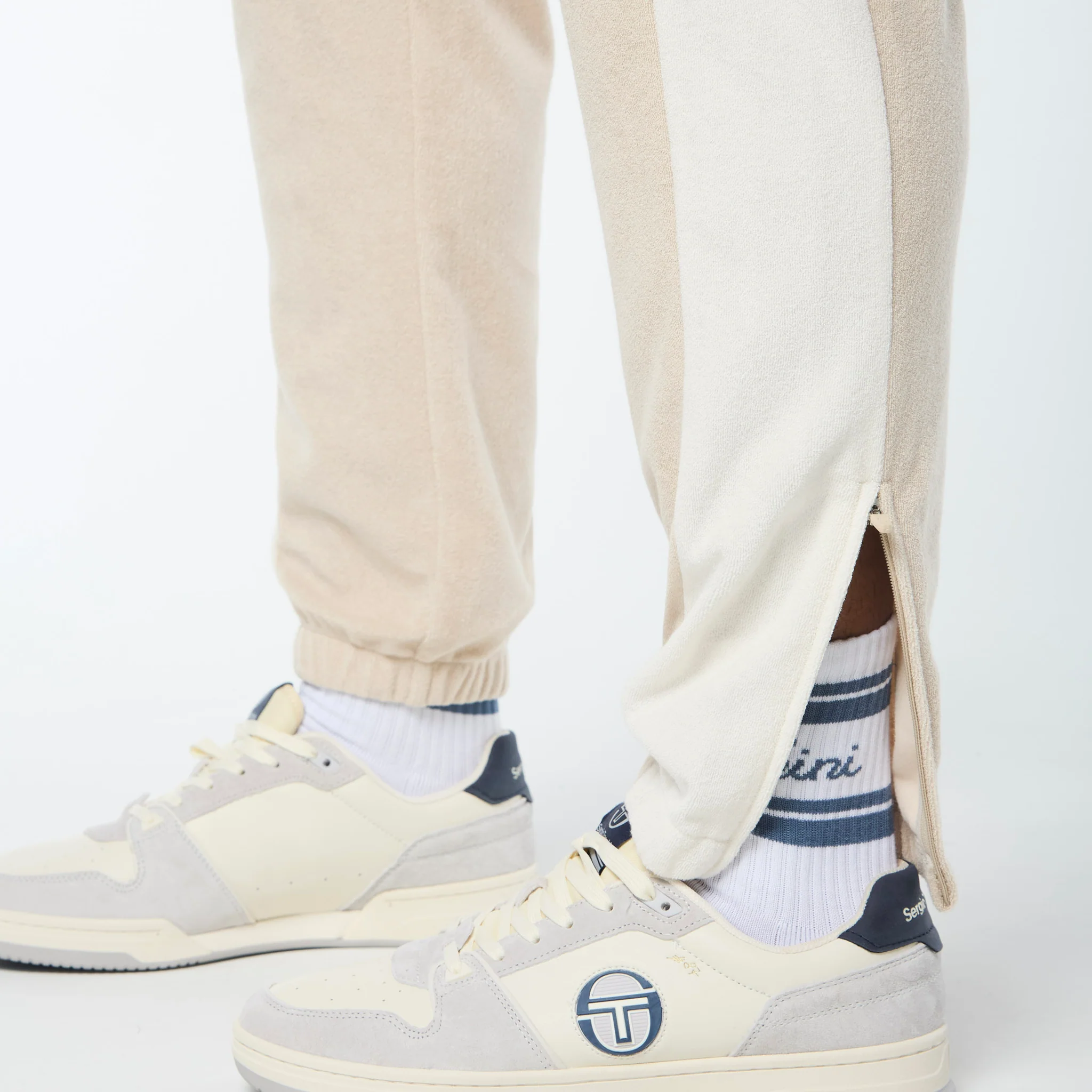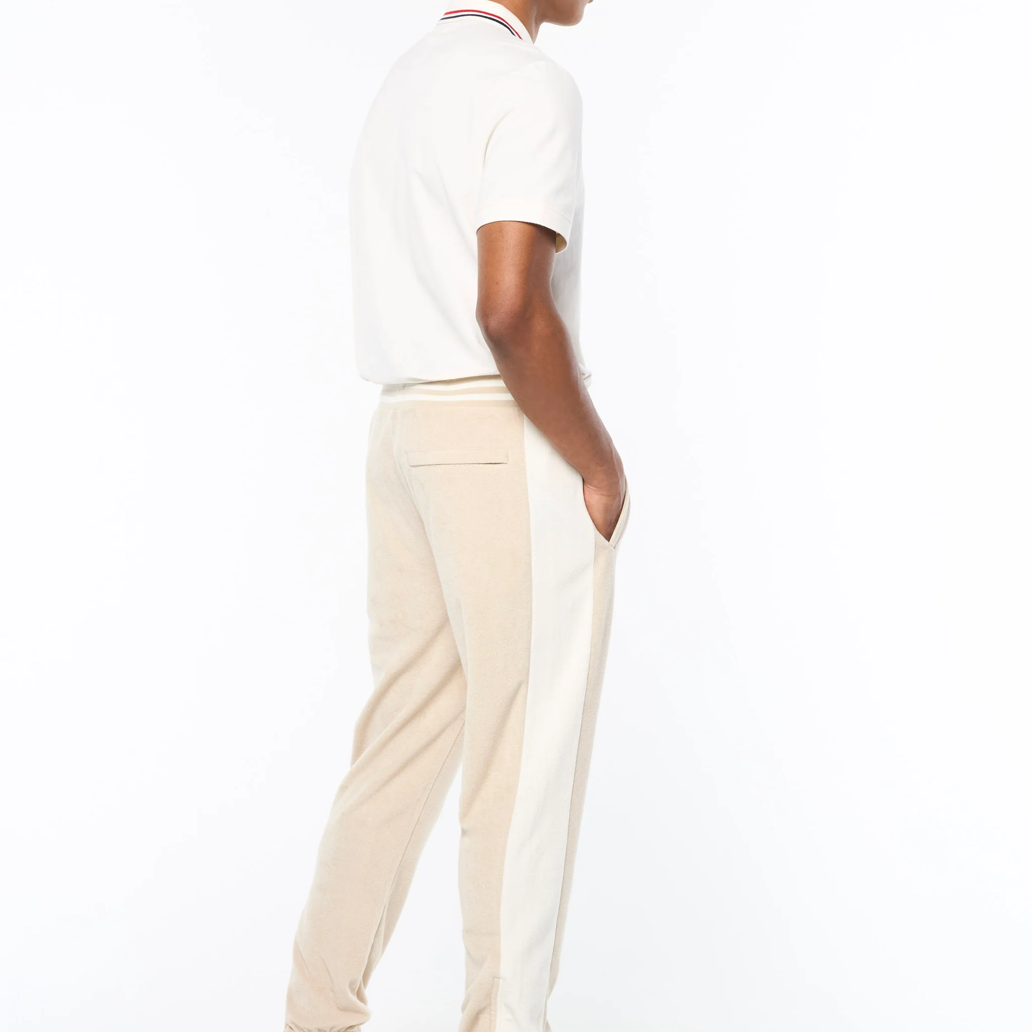 Upgrade your warm-weather wardrobe with the Vitus Track Pant, crafted from luxurious terry towel fabric for contemporary comfort with a touch of breezy nonchalance. Featuring a soft rib-knit waistband and adjustable ankle zips, these premium track pants are finished with color-block paneling and stripe details as a nod to retro leisurewear.