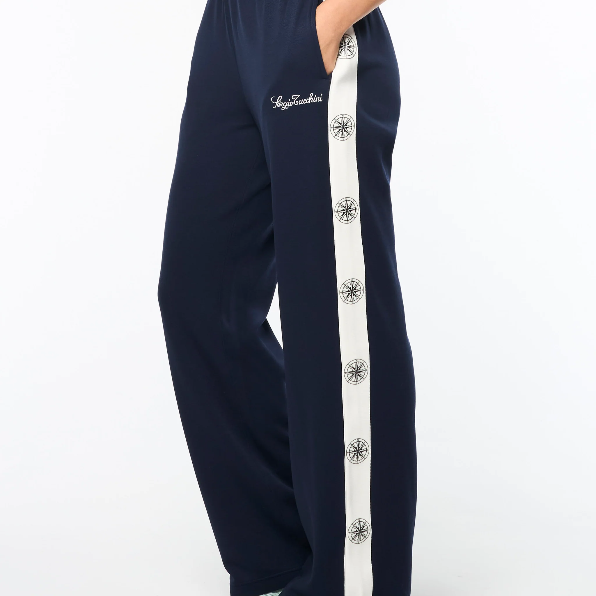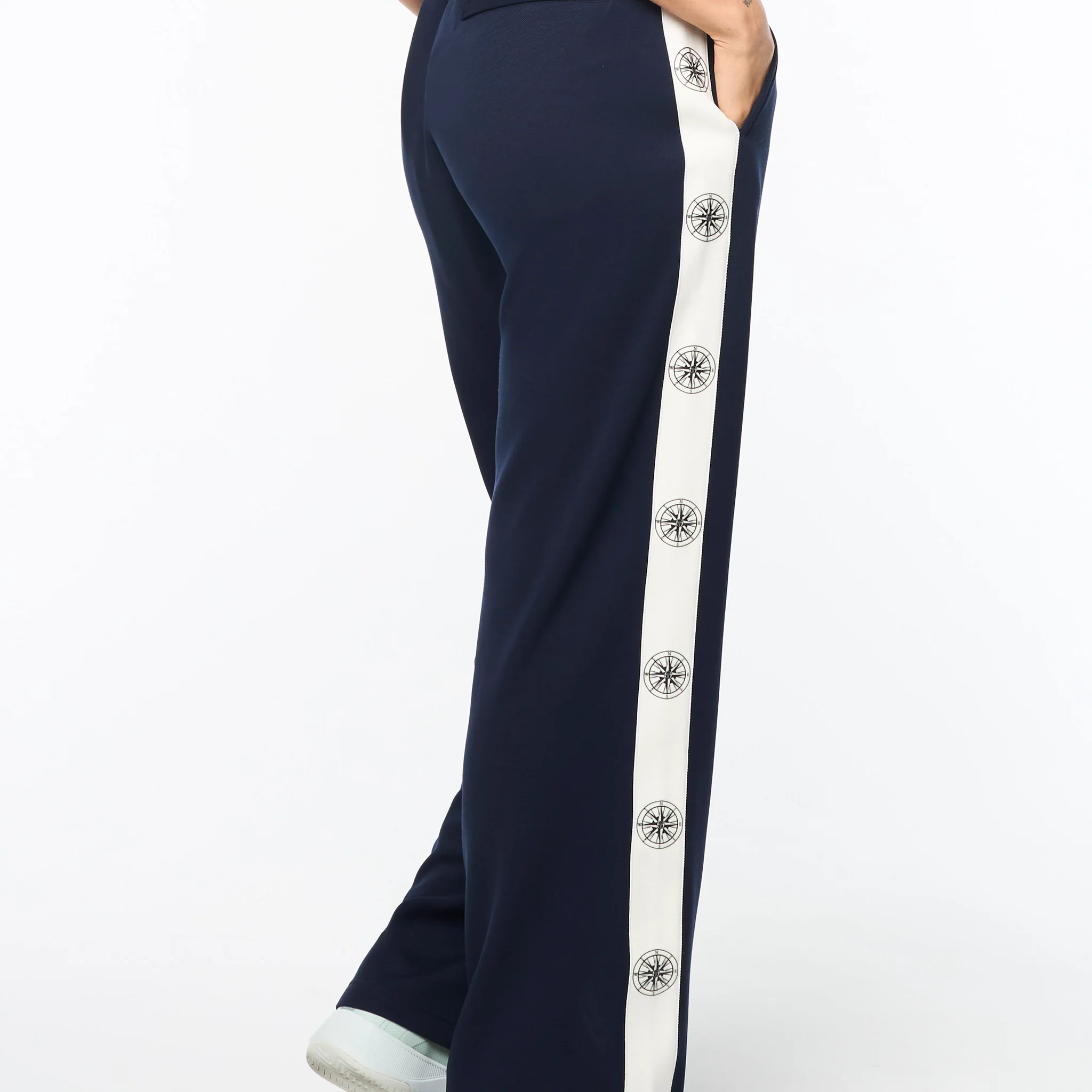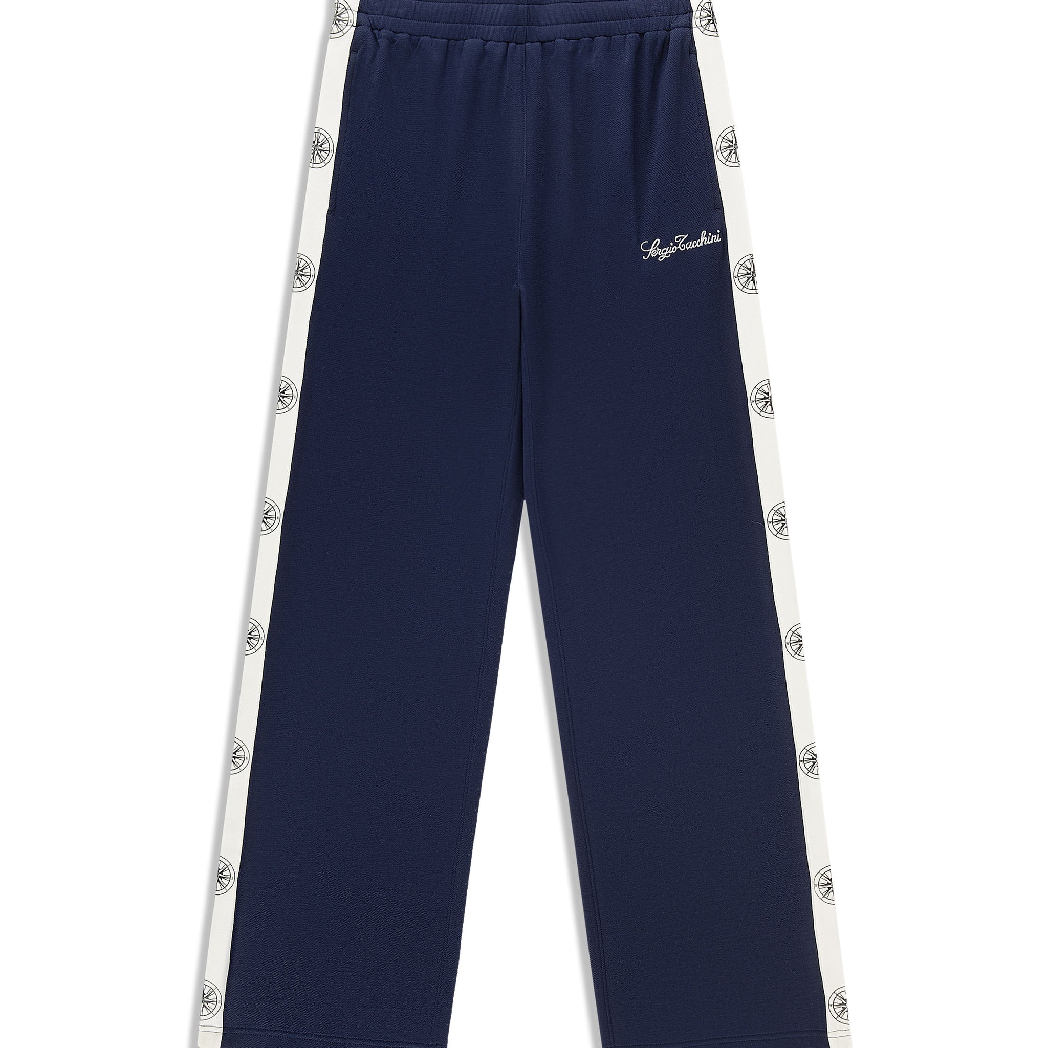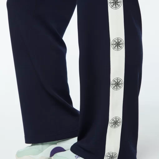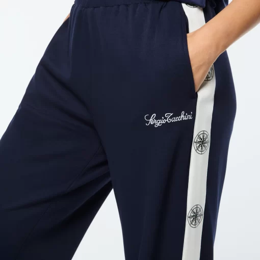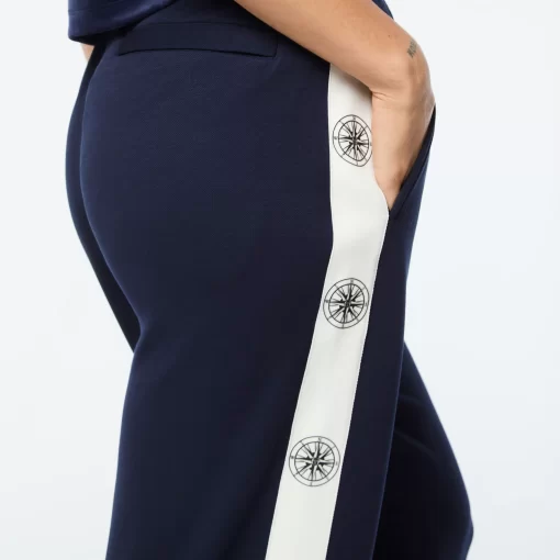 Set sail in our Women’s Bussola Track Pant, crafted from a luxurious Tencel blend piqué fabric that’s soft and breathable with a subtle stretch—perfect for active individuals and athleisure-wear enthusiasts alike. Featuring a nautical “Compass” rose repeat motif across contrast taping down the legs, these refined track pants offer style and comfort with a Riviera vibe.