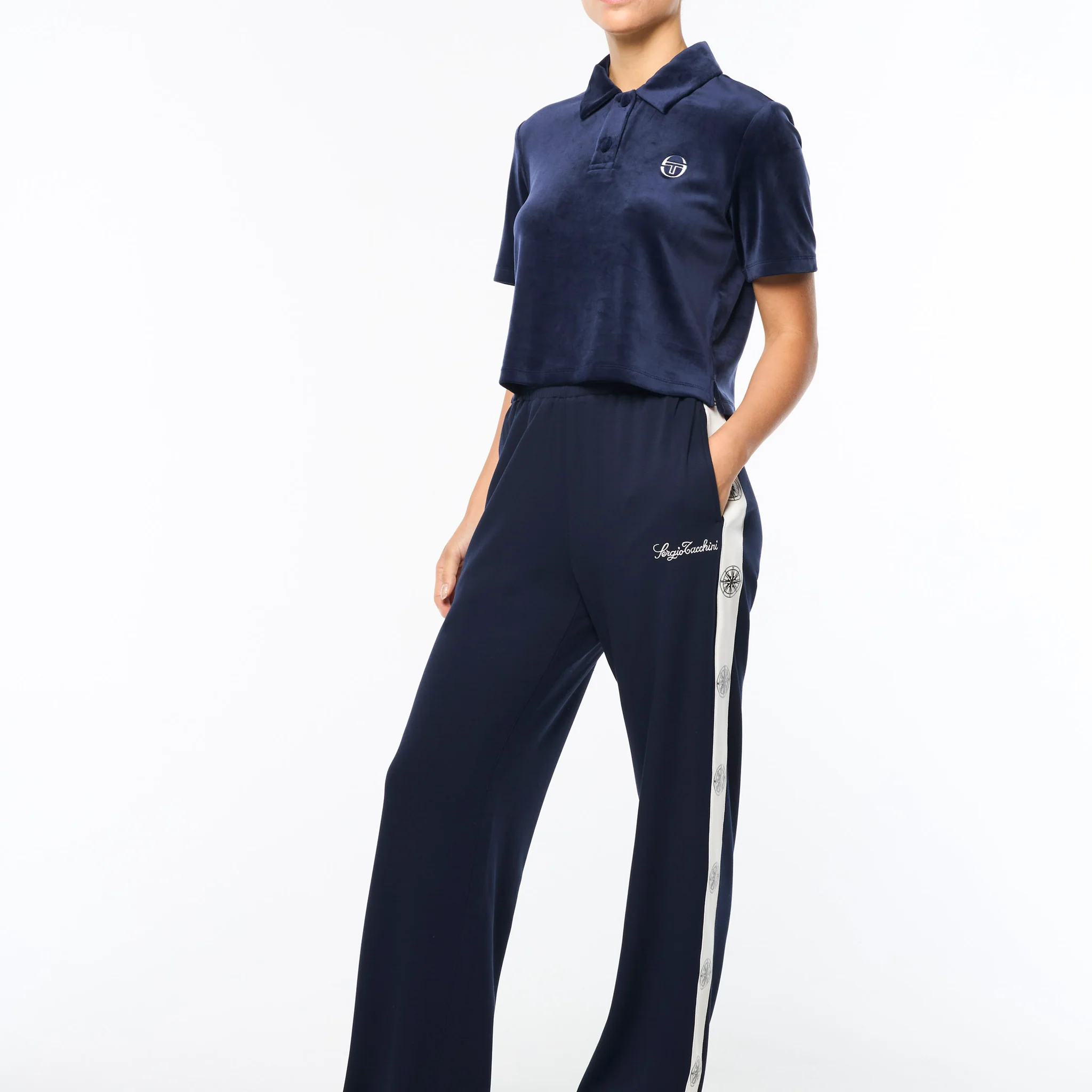 - Embroidered Sergio Tacchini script logo at left thigh