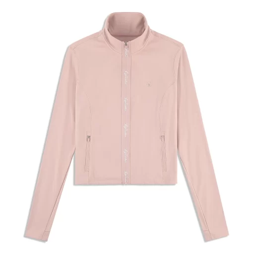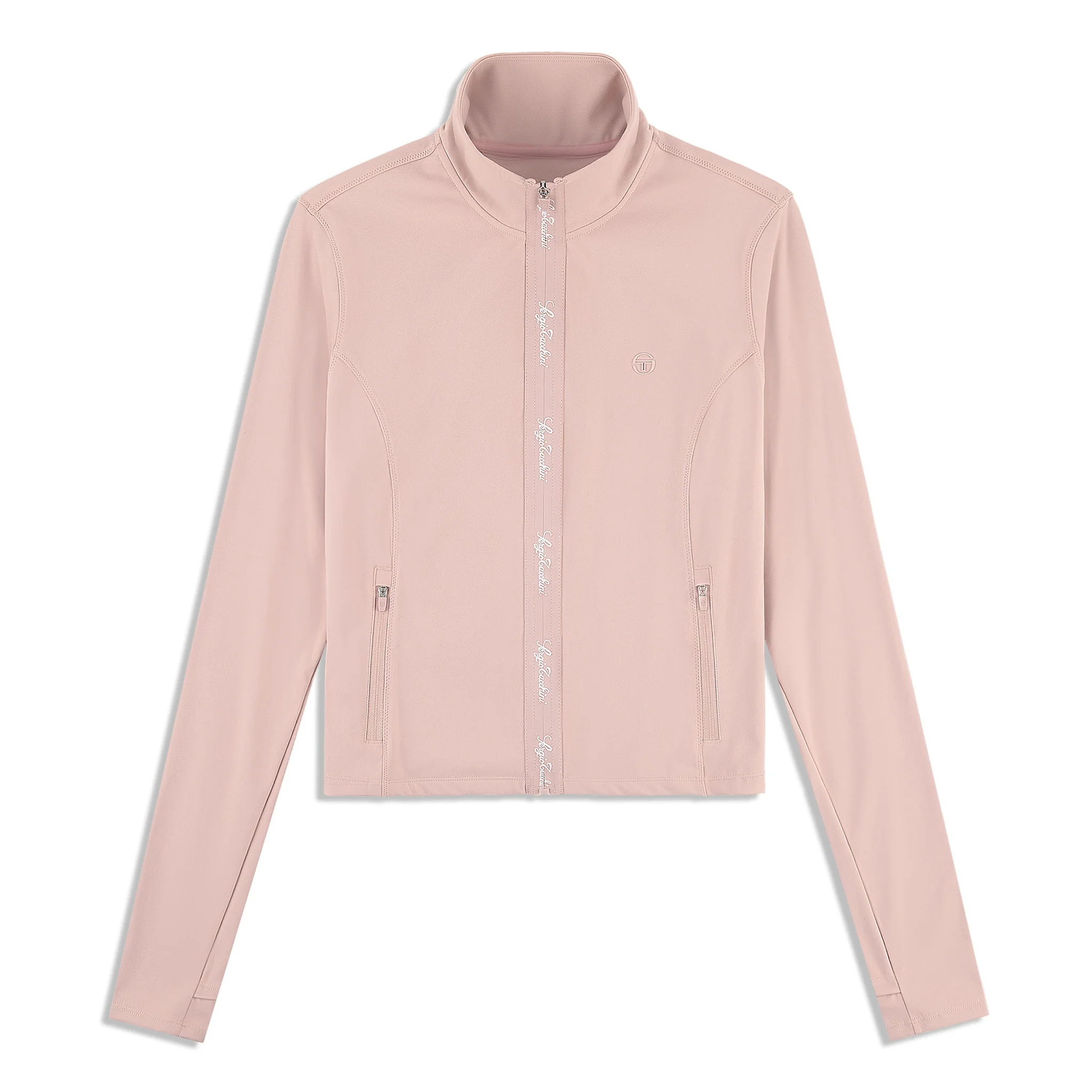 Crafted from lightweight performance fabric that’s buttery-soft, stretchy, and supportive, this athletic jacket is cut with an aqua zipper featuring a repeat script logo down the front. Handy thumbholes keep the chill out, while flattering princess seams contour the body for a feel-good fit.