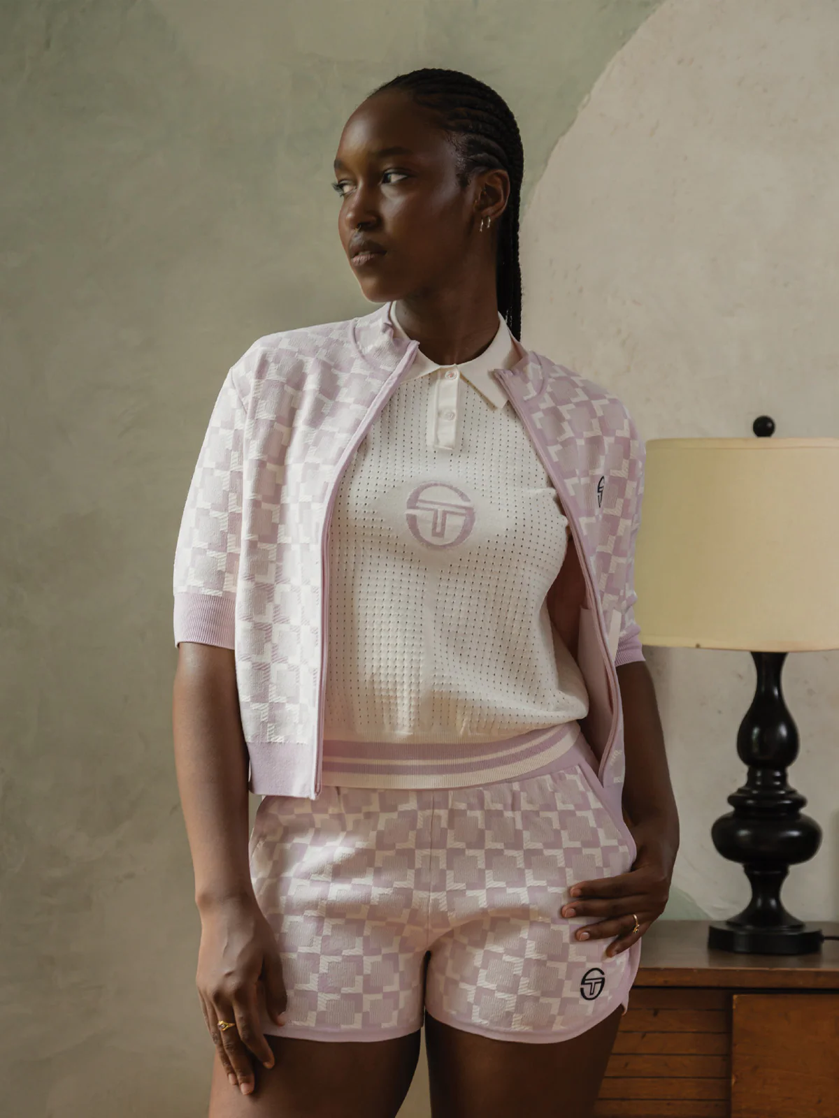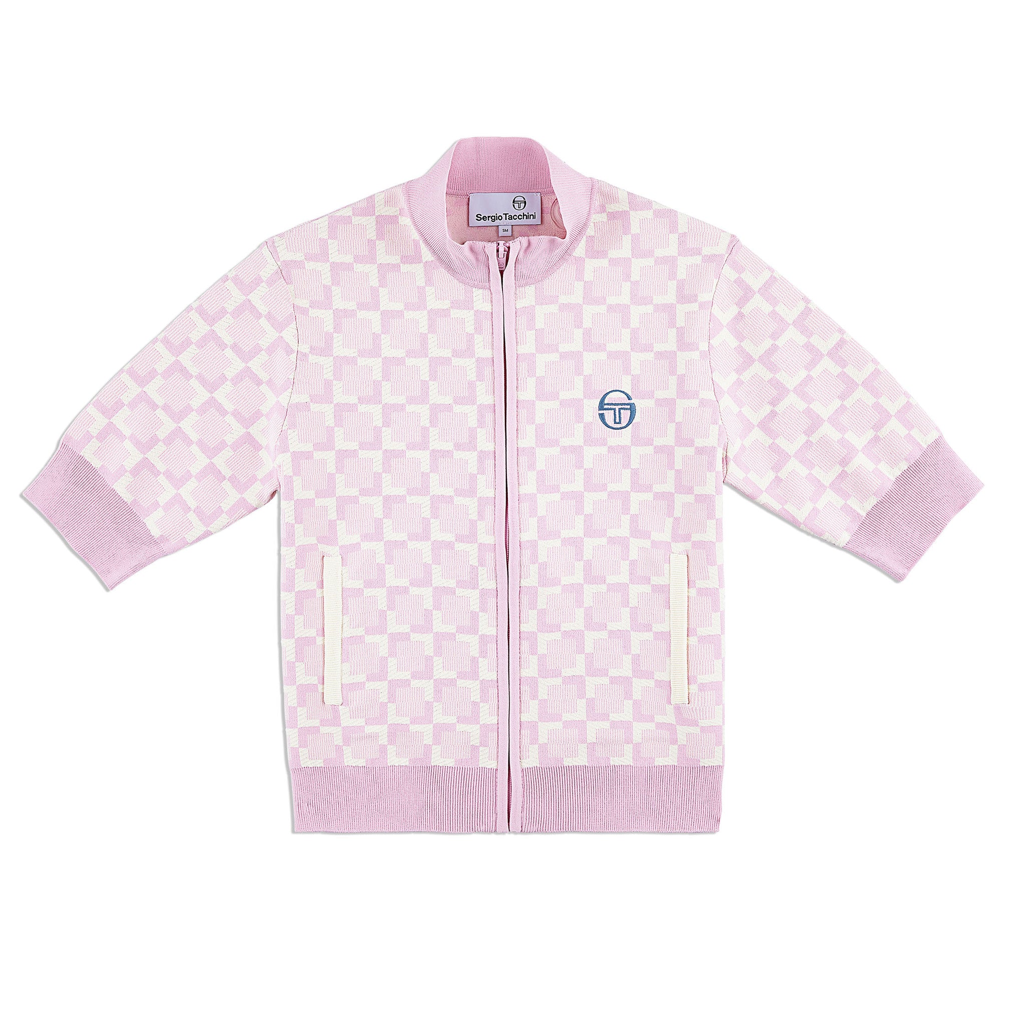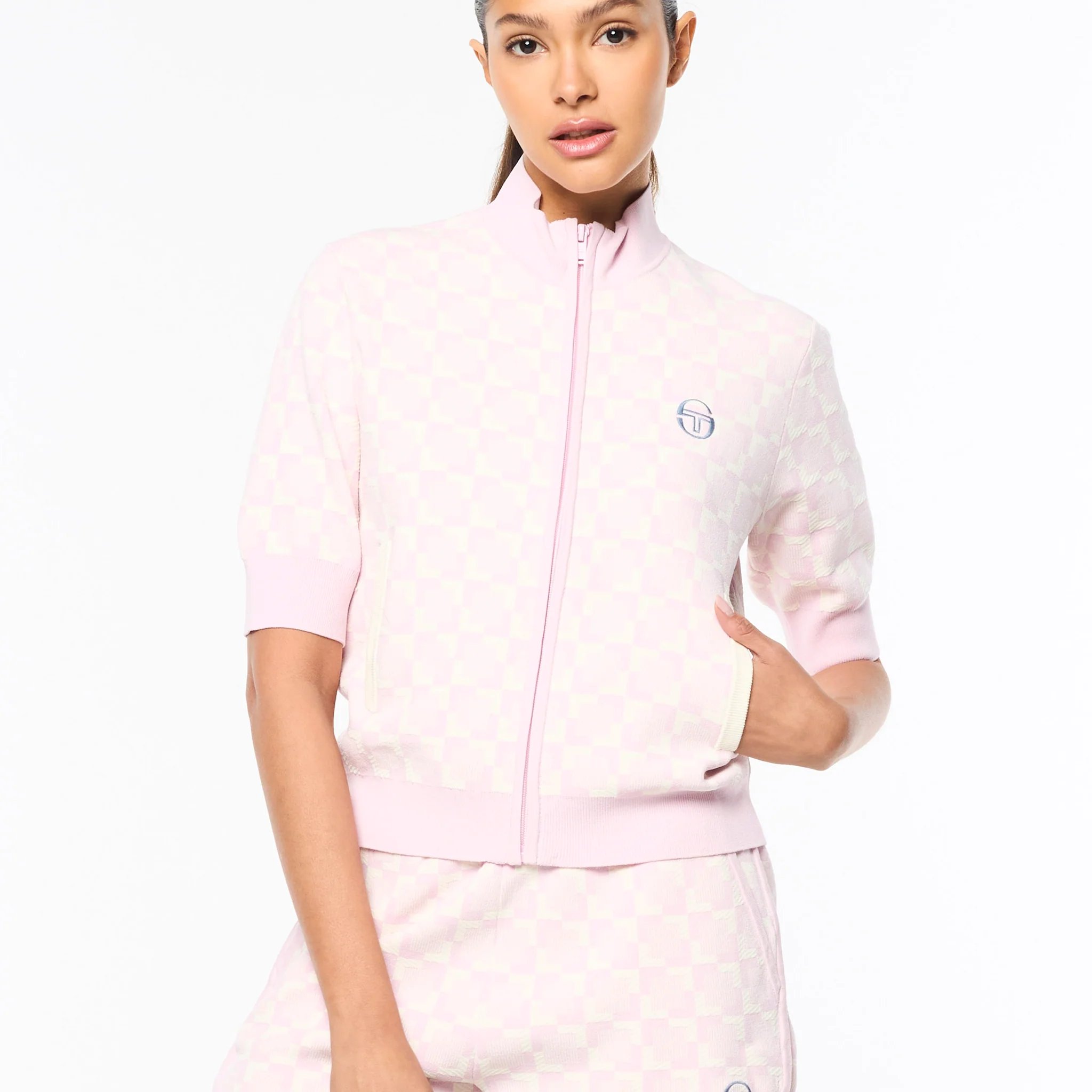 The Leila Short Sleeve Track Jacket is expertly crafted from a luxurious matte viscose and elite fiber blend that’s lightweight and breathable with a sturdy handfeel. Knit using an intricate birdseye-back jacquard technique, this elevated zip-up features an all-over geometric motif and super-soft ribbed trims.