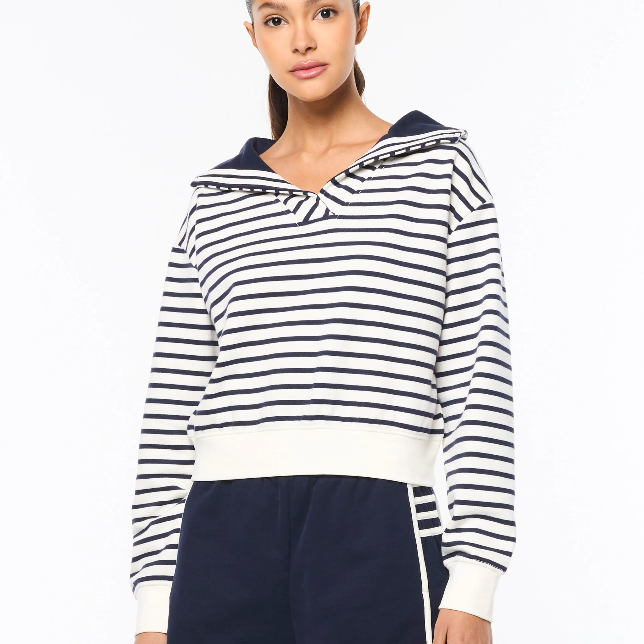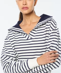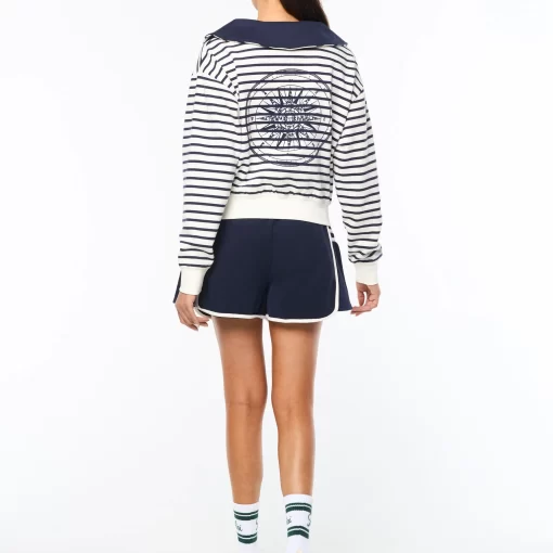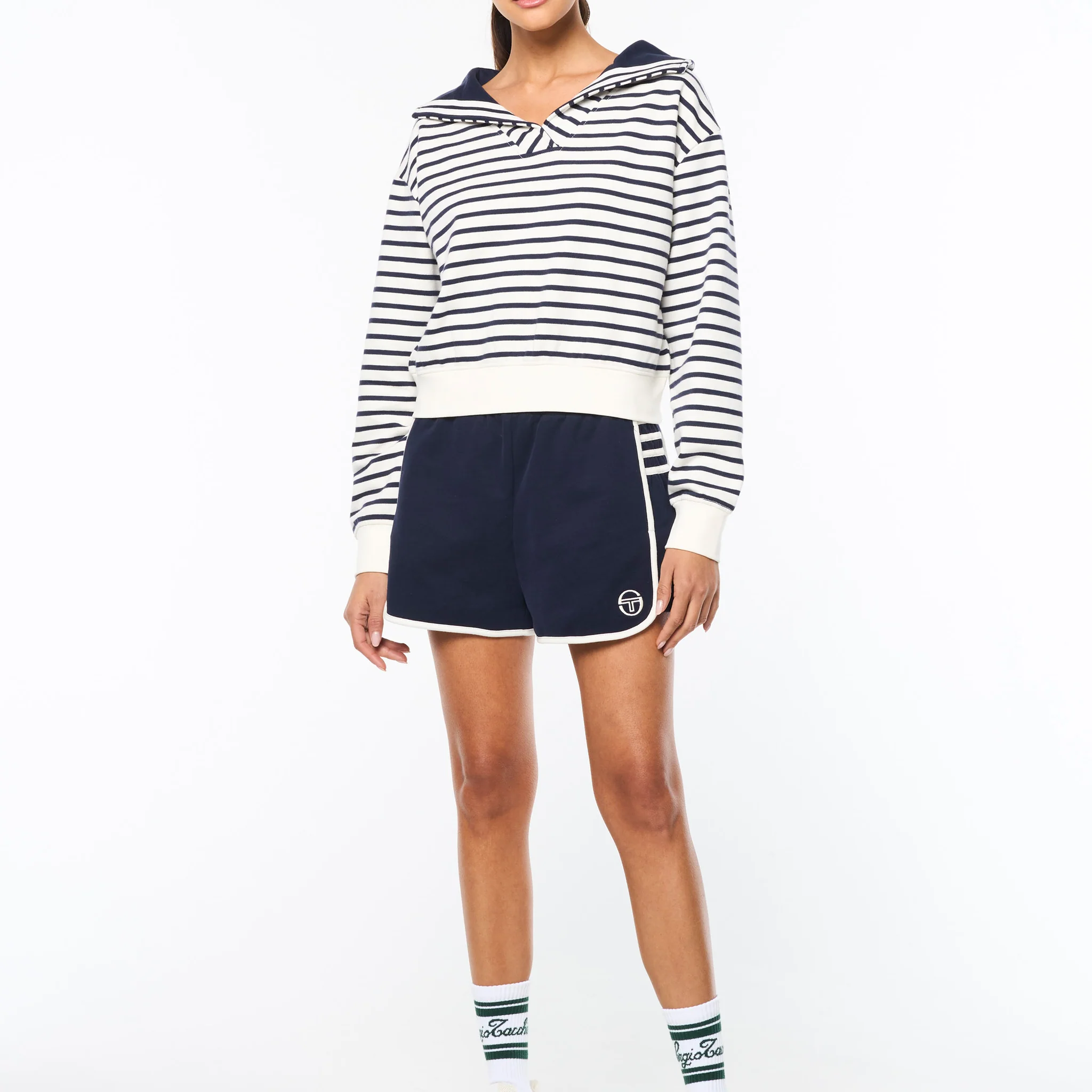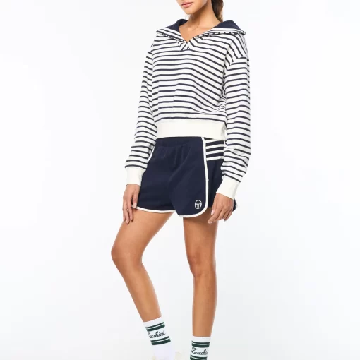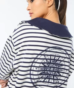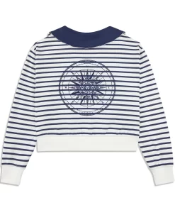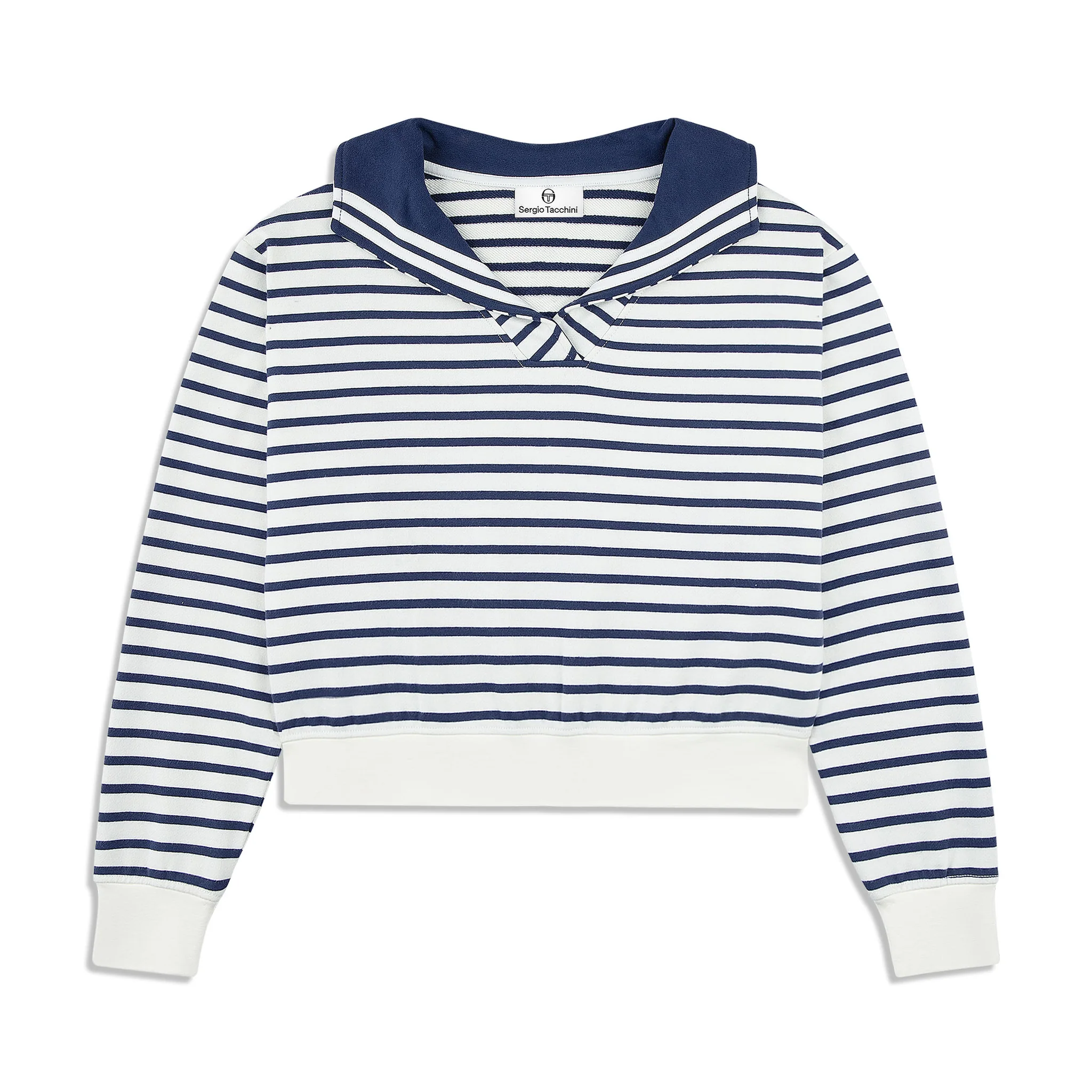 Set sail in the Marina Sailor Collar Sweatshirt, crafted from super-soft French terry cotton with maritime striping for maximum comfort with a nautical vibe. Embodying the spirit of exploration, this seaside-themed sweatshirt is finished with a classic sailor collar and a custom Sergio Tacchini compass rose in textured flocking at the back.